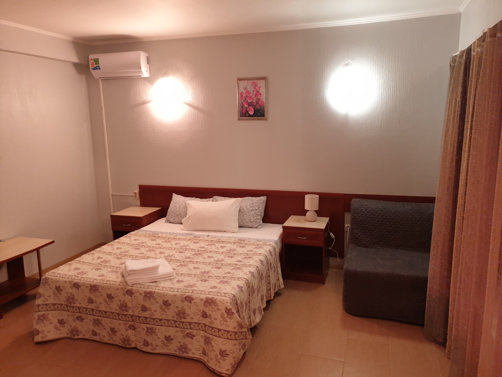 Просторный уютный номер на 3 места. Расположены на 2 и 3 этажах с видами на бассейн или горы. В оснащение номера входит: 2х спальная кровать, футон, LCD телевизор, сплит система, холодильник, санузел с душевой, выход на свою террасу с сушилкой, столиком и легкими креслами. Цены: 15.05-31.05: 2250р. 01.06-30.06: 2700р. 1.07-31.08: 3700р. 1.09-20.09: 2800р. 21.09-30.09: 2300р.