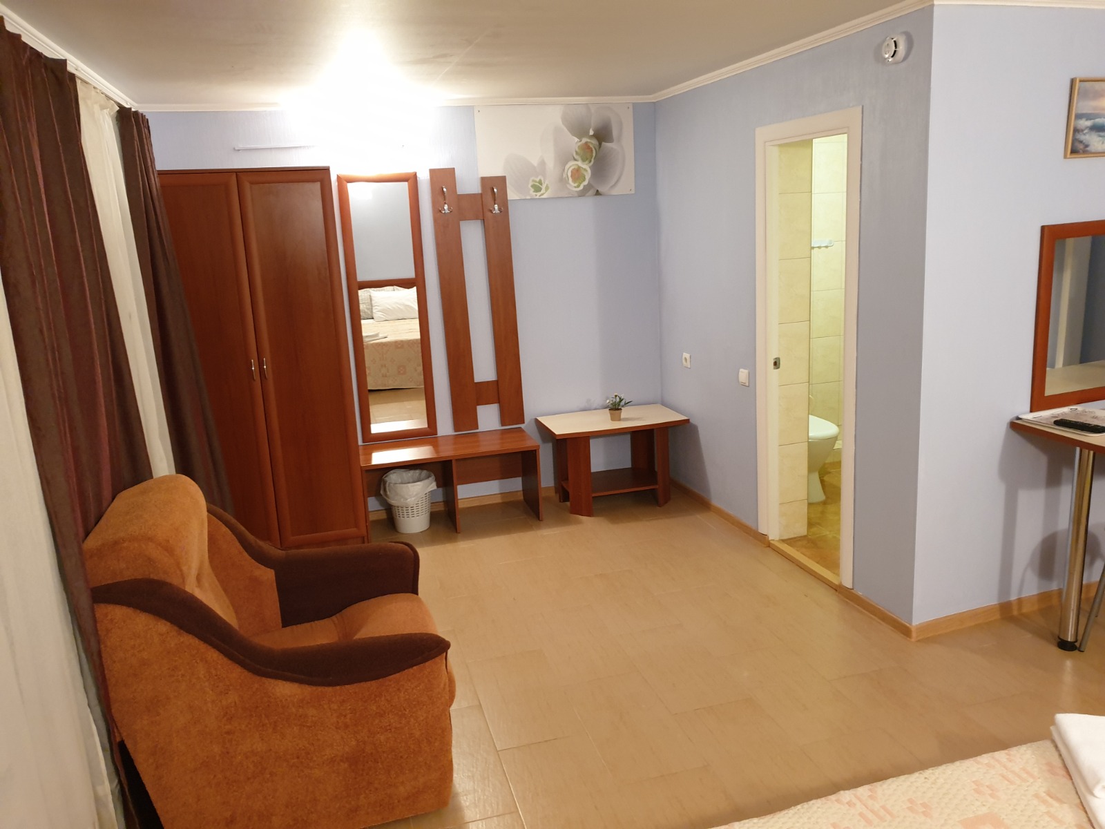 Уютный номер для семьи с детьми на 4 спальных места. Расположены на 2, 3 и 4 этажах с видами на бассейн или горы. В оснащение номера входит: 2х спальная кровать, 2х ярусная кровать для детей, LCD телевизор, сплит система, холодильник, санузел с душевой, выход на свою террасу с сушилкой, столиком и легкими креслами. Цены: 15.05-31.05: 2700р. 01.06-30.06: 3300р. 1.07-31.08: 4300р. 1.09-20.09: 3200р. 21.09-30.09: 2800р.
